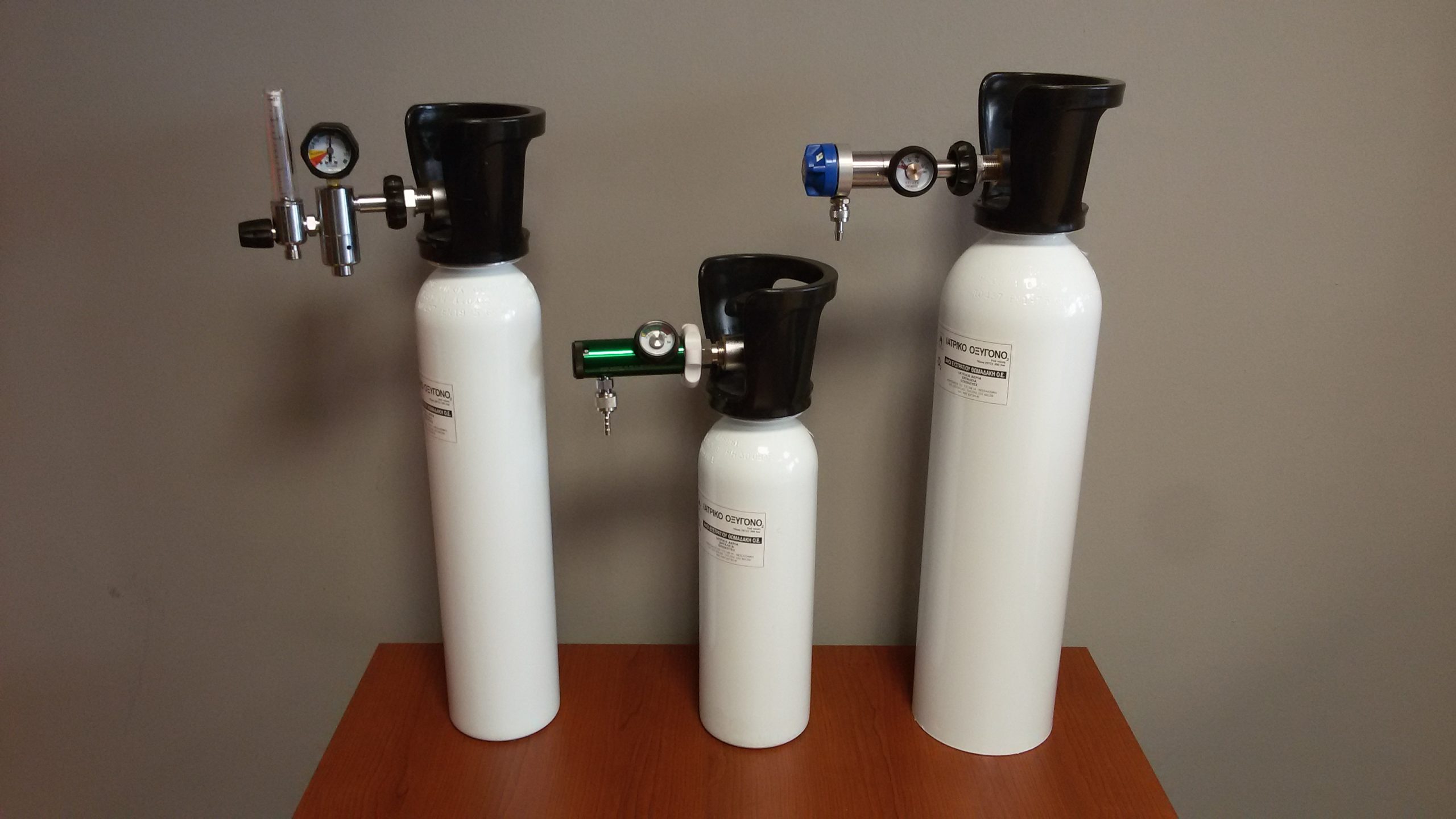 Φιάλες ιατρικού οξυγόνου αλουμινίου με μανόμετρο – ροόμετρο ένδειξης περιεχομένου και διακόπτη ελέγχου ροής οξυγόνου.